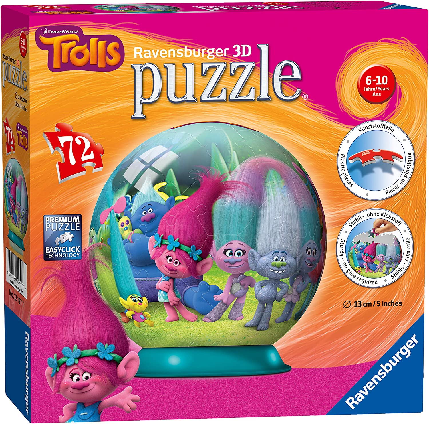 Този уникален 3D пъзел с мотиви от новия филм на DreamWorks „Тролчетата“ ще зарадва всяко дете. Изграден от 72 висококачествени извити пластмасови части, пъзелът се превръща в красива сфера с диаметър 13 см, която оживява любимите герои. Сглобяването на 3D топка от парчетата е забавно и развива пространственото мислене и концентрация.