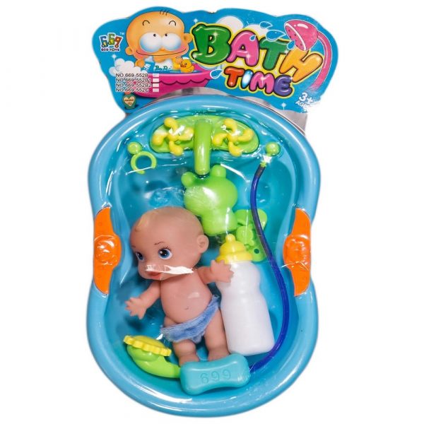 Комплектът съдържа вана с душ, бебе, шишенце, биберон, играчка за баня и макет на сапун.