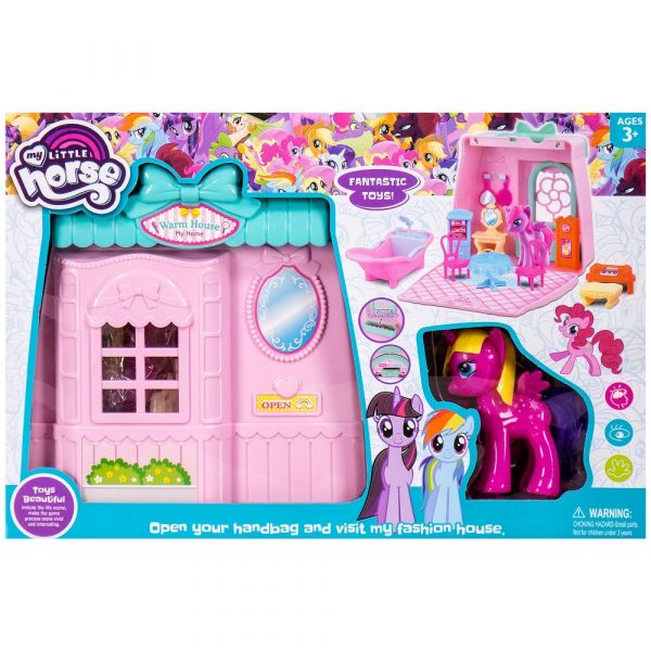 Комплектът съдържа къща, две понита, вана, масичка, столчета и други аксесоари.