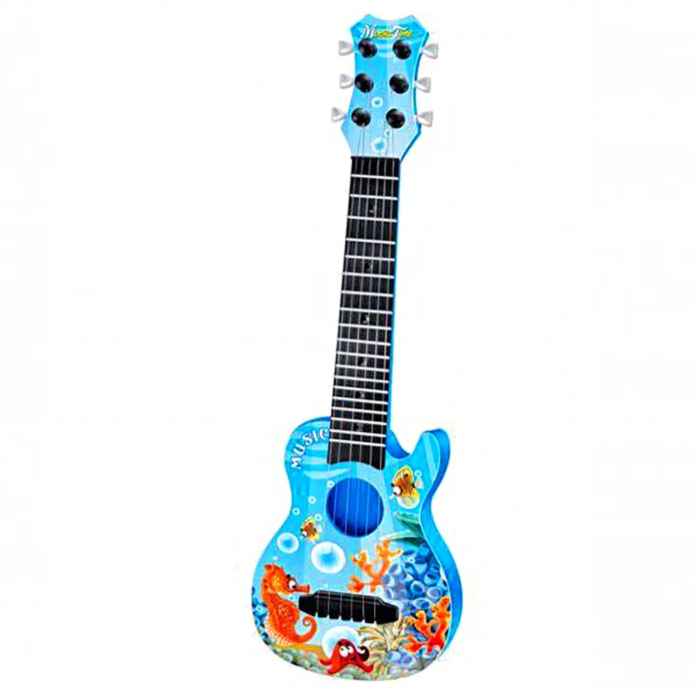 Комплектът съдържа пластмасова китара с метални струни и пластмасово перце.