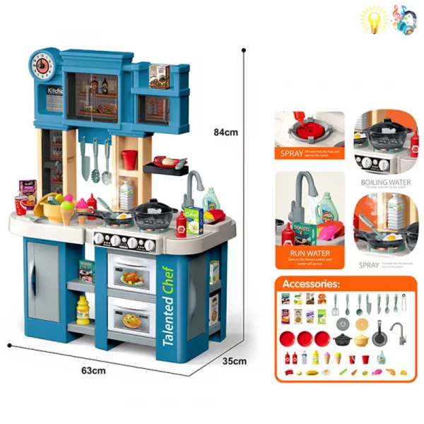 Функции: светлинни ефекти, реална функция течаща вода от крана на мивката, ляв котлон с механизъм за пара – парата не е гореща и е безопасна за деца!