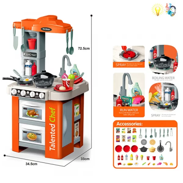 Детска кухня със светещи керамични котлони, реалистични звуци и мивка с течаща вода (72.5см) – Код W4490