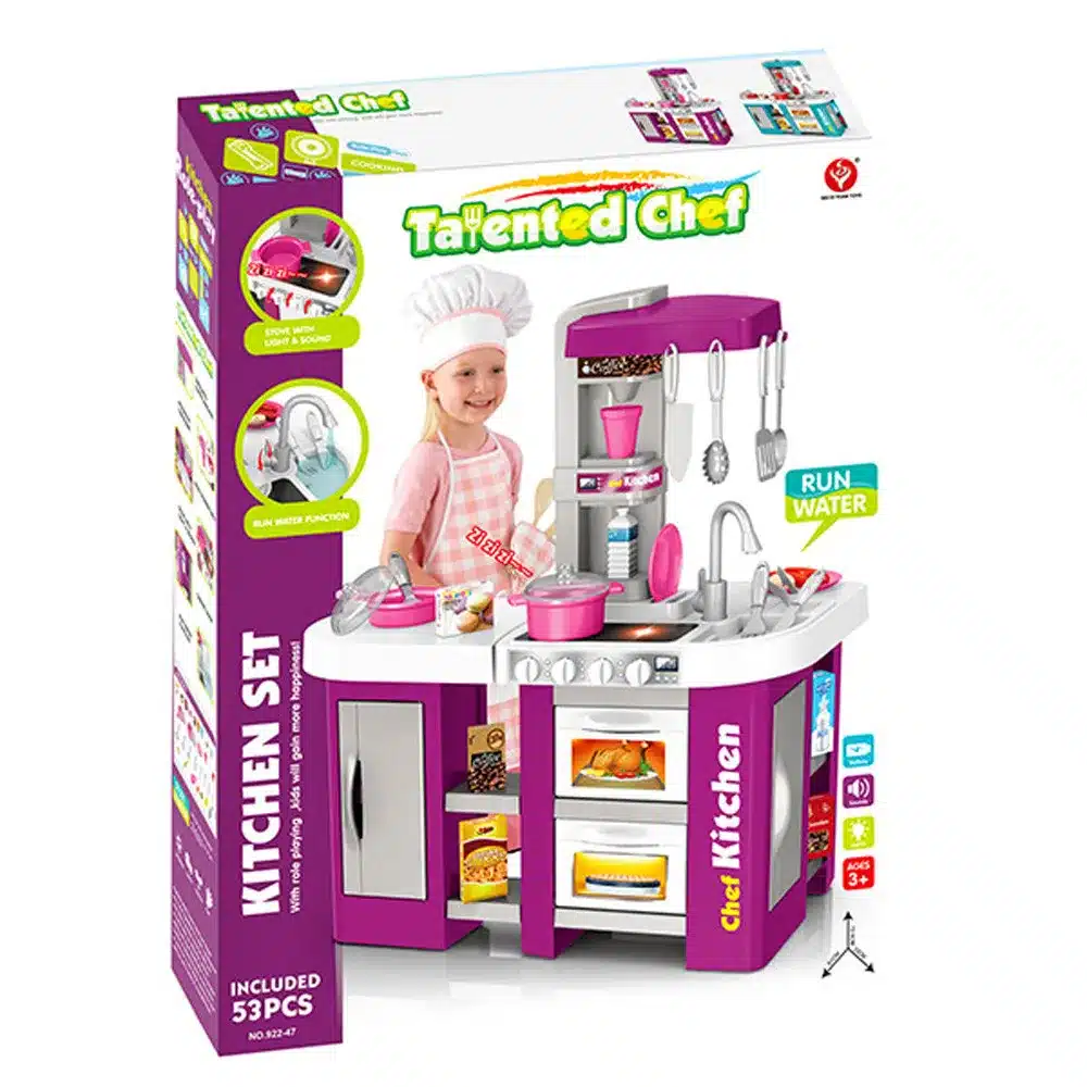 Функции: реална функция течаща вода от крана на мивката, светещи котлони, реалистични звуци на приготвяне на храна, отваряеми врати на фурните и хладилниците.
