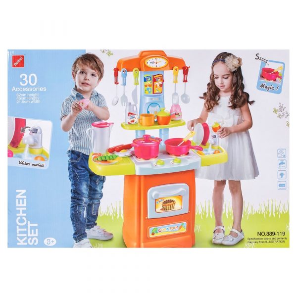 Комплектът съдържа сглобяема кухня-куфар с дълга дръжка и колелца, съдове и прибори за готвене и макети на хранителни продукти.