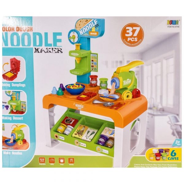 Комплектът съдържа масичка, 4 цвята моделин в кутийки (4 х 55 гр), бетонобъркачка, машина за пътна настилка, самосвал, фадрома, формички за моделиране.