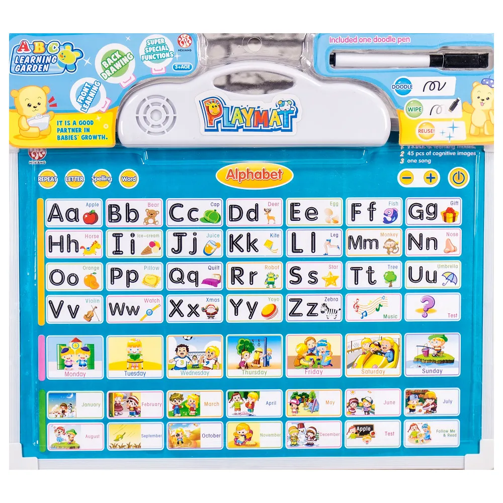 От другата страна има сензорни бутони за изговаряне на английската азбука, дните от седмицата, месеците и някои думи, бутон за песничка, за повтаряне на изговорени фрази, за спелуване и бутони за въпроси.