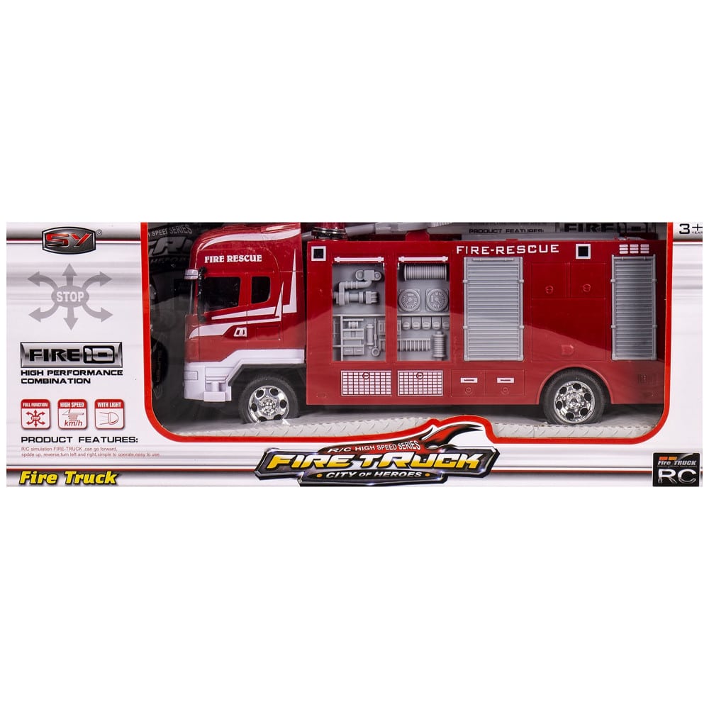 Комплектът съдържа пожарна кола, дистанционно управление, зареждащи се батерии за пожарната и зарядно устройство.