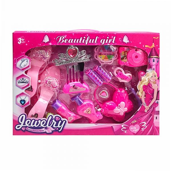 Комплектът съдържа куфар, който може да се преобразува в настолна тоалетка или тоалетка на стойка и аксесоари за красота (гривнички, пръстенчета, герданче, четка за коса, макети на парфюм, на лакове за нокти и на червила и макет на сешоар).