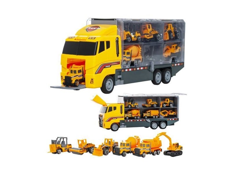 - Комплектът включва: Камион автовоз и 6 строителни машини