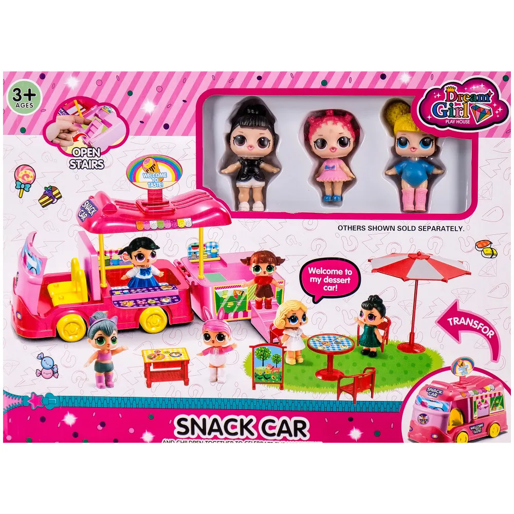 Комплектът съдържа три кукли, бус, трансформиращ се в заведение, масички, столчета, чадър.