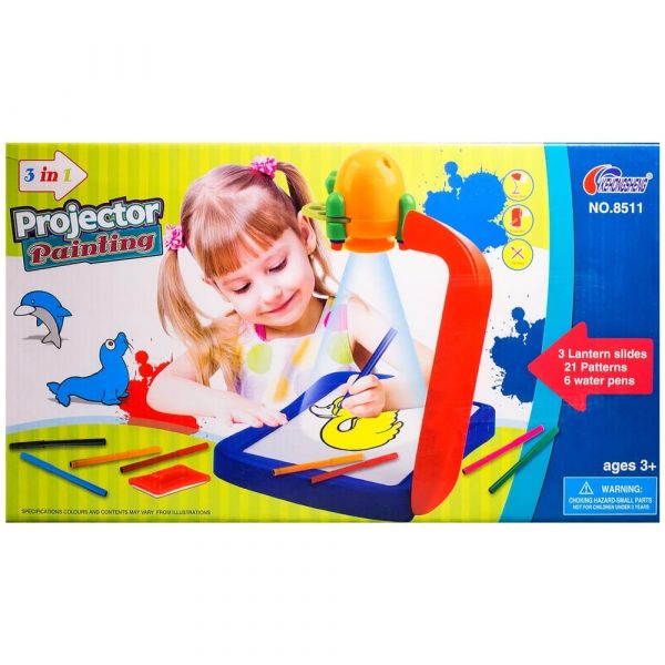 Комплектът съдържа чин, проектор с лампа, столче, 6 диска с 42 примерни картинки за прерисуване, 12 цветни флумастера, изтриваща гъбка и магнитни елементи (буквите от английската азбука, цифрите от 0 до 9, математически символи).