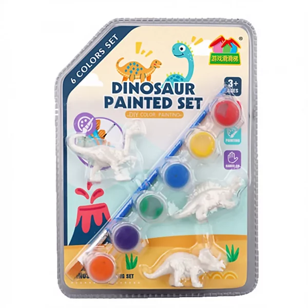 Комплектът съдържа: 3 фигурки на динозаври, 6 акварелни боички, четка.