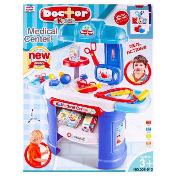 Комплектът съдържа количка с докторски принадлежности-стетоскоп, спринцовка, ножички, светещо табло, светещи термометър, лъжичка за преглед на гърлото, пулсометър и отоскоп, легенче, очила, три рентгенови снимки, кошничка и други.