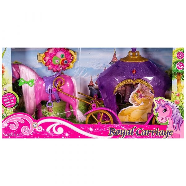 Комплектът съдържа дворец с отваряеми врати, музика, вълшебни звуци и светлинни ефекти, каляска с кон, фигурки на принц и принцеса, обзавеждане и аксесоари.