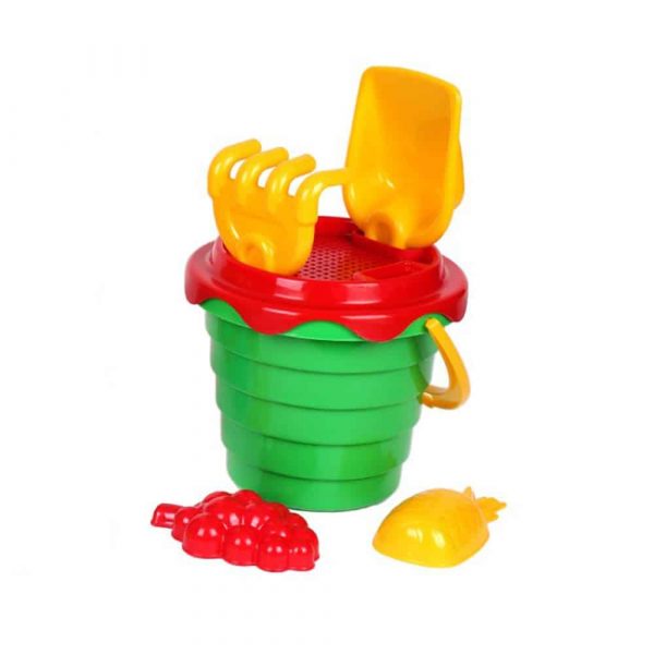 Комплектът съдържа кофичка, сито, лопатка, гребло и две формички плодчета.