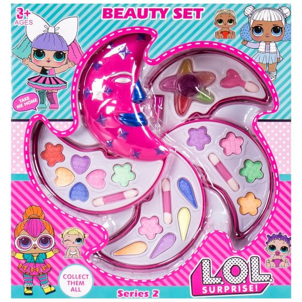 Комплектът съдържа три палитри със сенки за очи, гланцове за устни, червило и апликатори за грим.