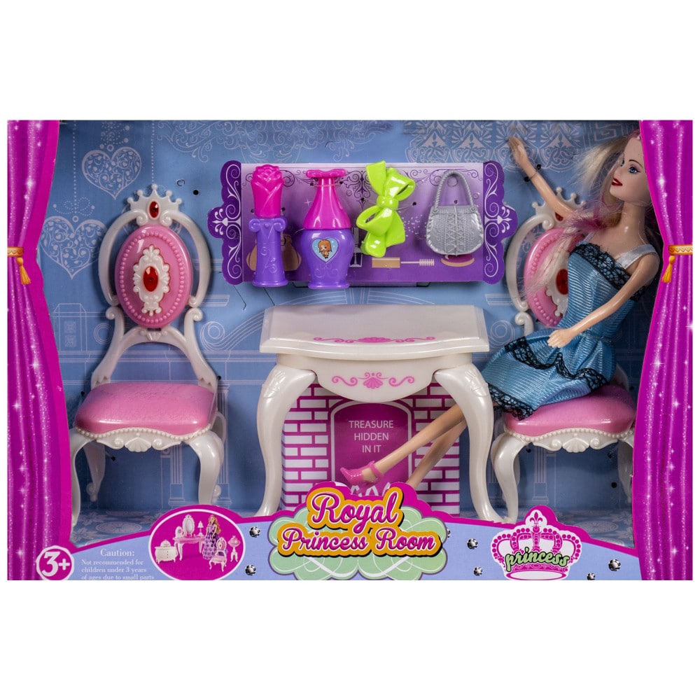 Комплектът съдържа кукла с чупещи се крака, тоалетна масичка, два стола, чантичка за куклата, макети на червило и лак, фибичка.