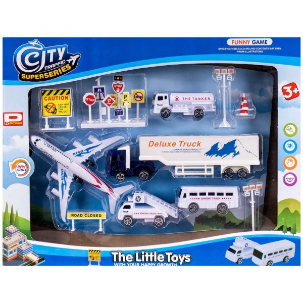 Комплектът съдържа 4 пожарни коли, самолет, автобус, бензиностанция и пътни знаци.