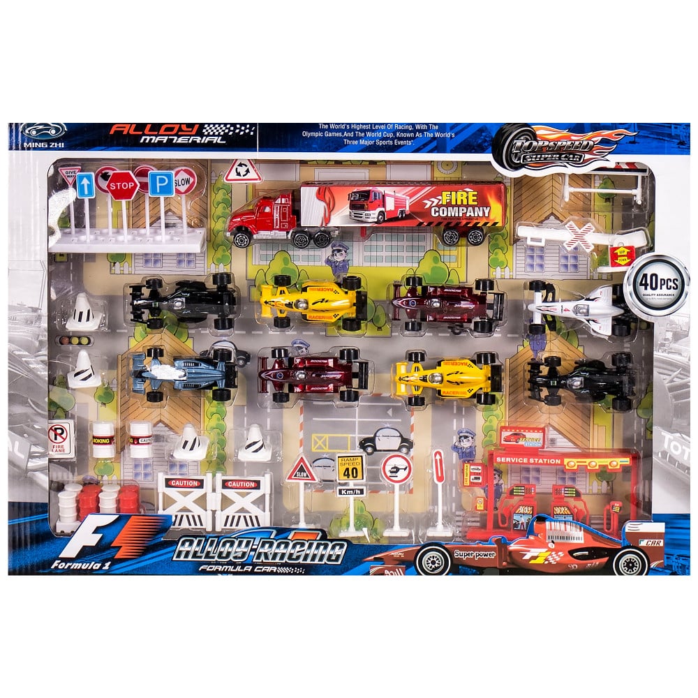 Комплектът съдържа осем метални болида с пластмасови елементи, камион тир с метална кабина и пластмасова каросерия, пластмасови пътни знаци, макет на бензиностанция и аксесоари.