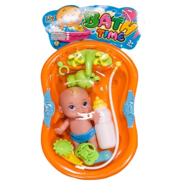 Комплектът съдържа вана с душ, бебе, шишенце, биберон, играчка за баня и макет на сапун.