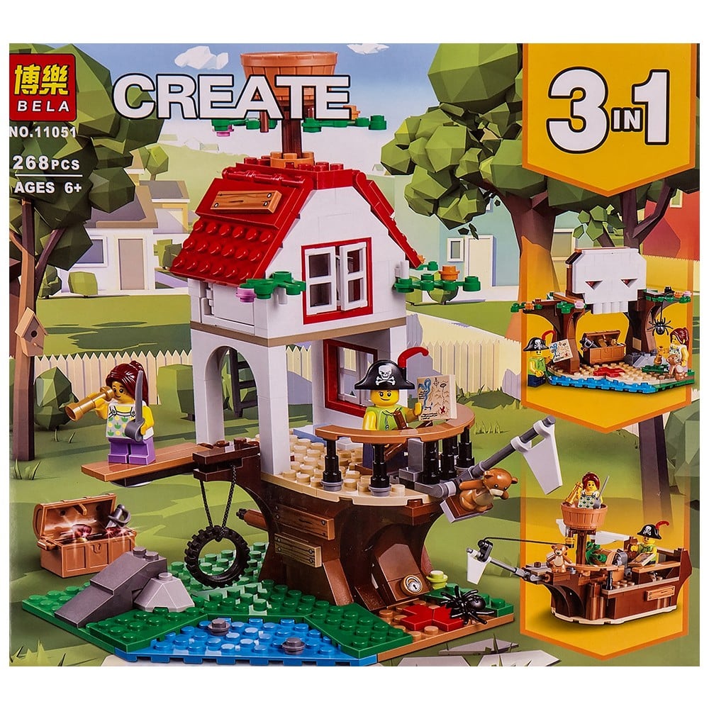 Комплектът съдържа елементи за сглобяване къща на дърво, пиратски кораб или пещера (не и трите едновременно), както и фигурки на момиче и момче.