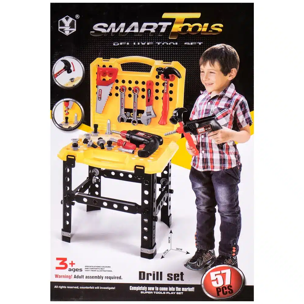 Комплектът съдържа куфар, работна маса, механичен винтоверт с реална функция въртене на свредела, трион, чук, отвертки, болтове, гаечни ключове, гайки, планки с отвори, сменяеми накрайници, които могат да се ползват за винтоверта и отвертките.