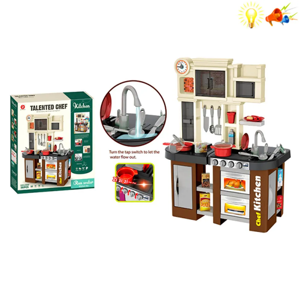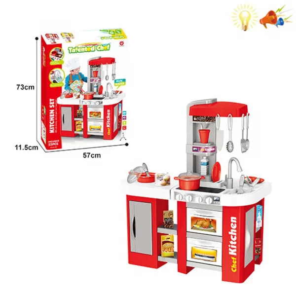 Функции: реална функция течаща вода от крана на мивката, светещи котлони, реалистични звуци на приготвяне на храна, отваряеми врати на фурните, хладилниците и шкафчетата.