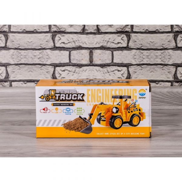 Функции: Pull back (дръпни назад и пусни и камиона ще тръгне напред), звук на работещ двигател, бутон за изсипване на товара със звук, светещи фарове.