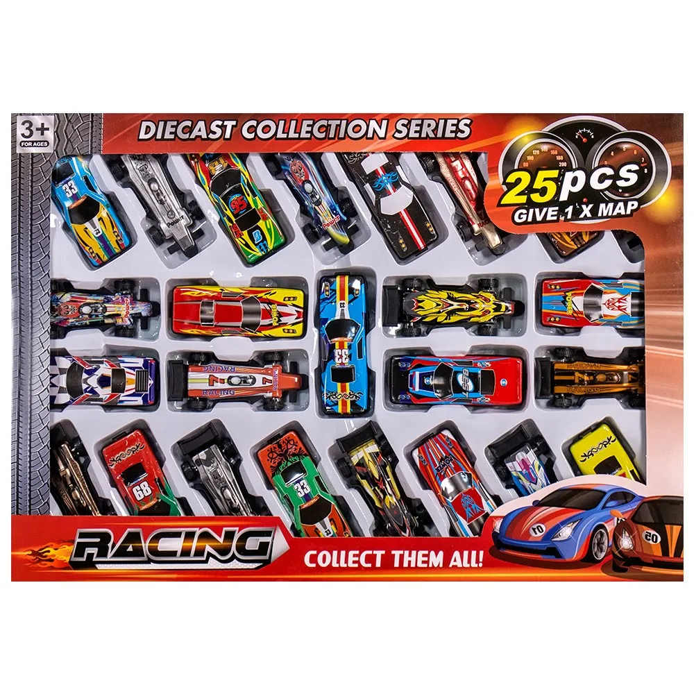 Комплектът съдържа 25 метални коли с пластмасови елементи и полиетиленово килимче с градска инфраструктура.