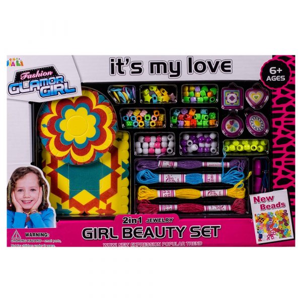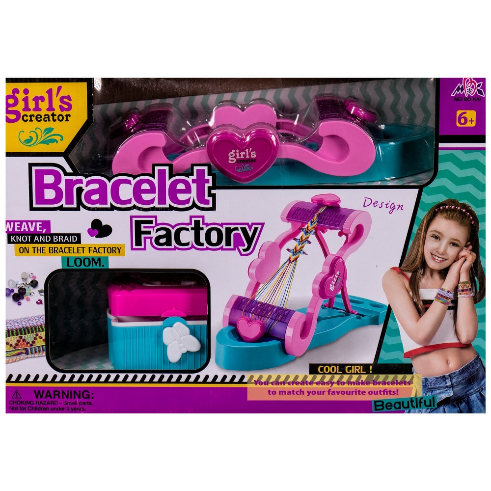Комплектът съдържа стан, кутийка, цветни мъниста и конци, на които се наплитат гривничките.