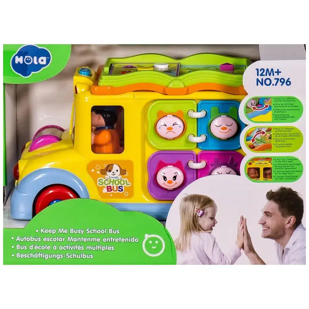 Функции: BUMP&GO (при преграда сменя посоката на движение), бутон за изключване на функцията BUMP&GO: в този режим играчката е подходяща за дърпане или бутане, звуци на запалване на двигател и клаксон, музика, бутон за изключване на музиката, светещи фарове, реалистични звуци на животни, книжка за прелистване на покрива на бусчето, поклащане на шофьора и пътника: наляво, надясно, въртящ се музикален елемент на предния капак на бусчето, отваряща се със забавен звук задна врата и три сменящи се картинки, звънче, въртящи се зъбни колелца.