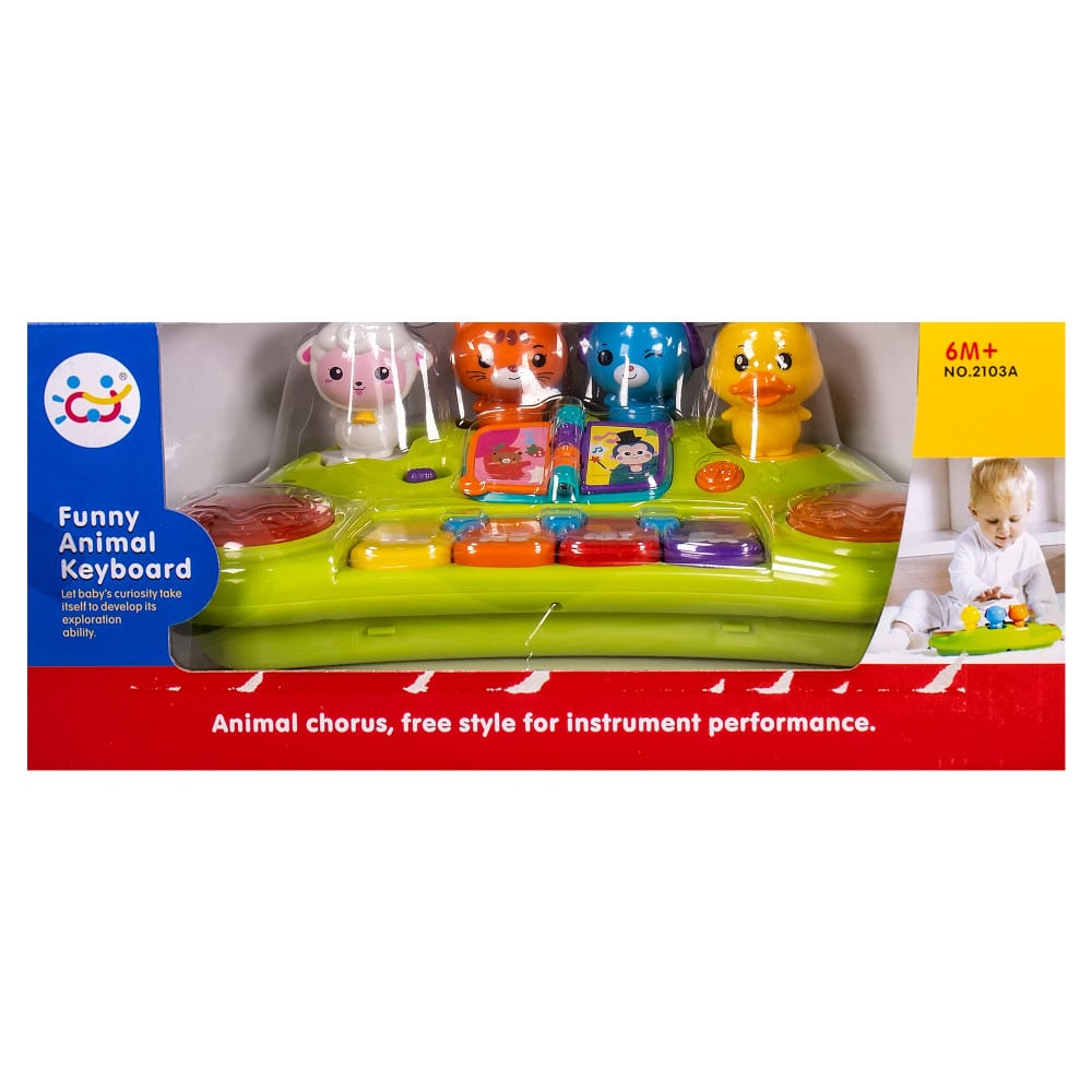 Функции: реалистични звуци на животни (пате, куче, коте и агънце), свирене по ноти, весели мелодийки, барабанни звуци, забавни звуци, светещи елементи, книжка за прелистване, чрез която се сменя режима на работа, бутон за регулиране на звука, бутон ON/OFF.