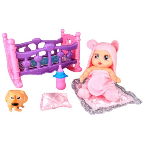 Комплектът съдържа бебе в хавлийка, легло (люлка), завивка, възглавничка, шишенце и кученце.