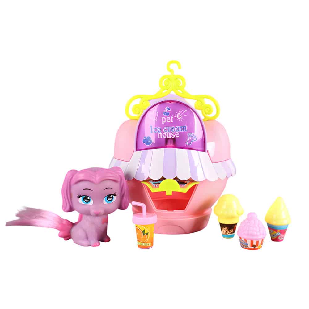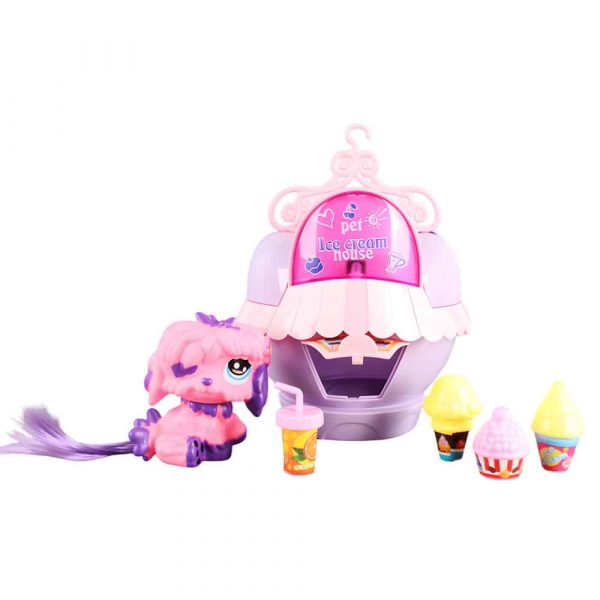 отваряща се къщичка, фигурка на кученце и макети на сладолед.