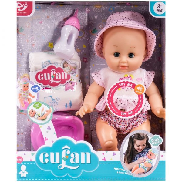Комплектът съдържа кукла бебе, памперс, гърне, шишенце, биберон, чинийка, лъжичка, три пакетчета сухо мляко, акт за раждане, гумена играчка за бебето.