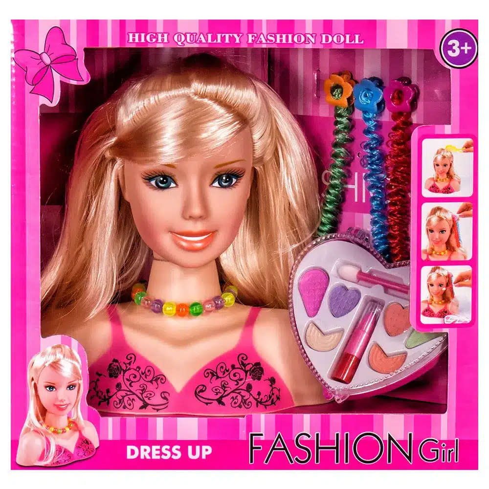 Комплектът съдържа бюст на кукла с дълга коса, герданче, цветни кичури, шнолки, гребен за коса и палитра с гримове (червило, сенки, ружове и апликатор).