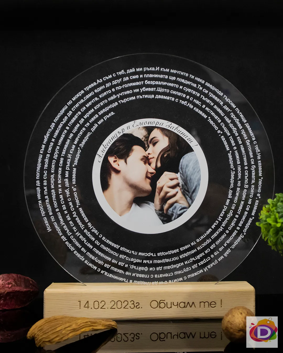 Любовта може да бъде изразена по различни начини. Ние Ви даваме възможност да изразите чувствата си към любимия човек с песен, текстът, на която да бъде директно напечатан върху плочата с вашата желана снимка, дата и имена. Така ще запазите най-скъпите чувства в спомен! От вас се изисква да ни изпратите любима песен, снимка и послание имейл или вайбър, а ние ще създадем скъп спомен за вас!