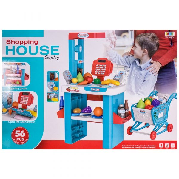 Комплектът съдържа сглобяем супермаркет с везна и макет на машина за сладолед, сглобяема количка за пазаруване и домакински прибори и макети на хранителни продукти.